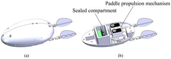A three-dimensional diagram of the overall structure of the paddle propulsion robot: (a) The overall structure of the robot. (b) The internal structure of the robot.