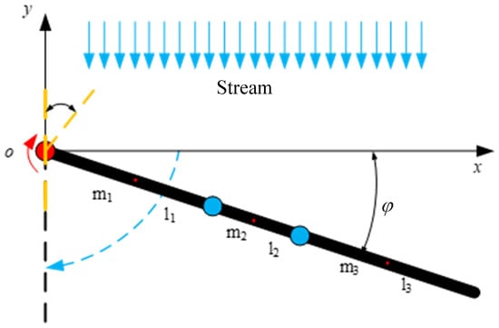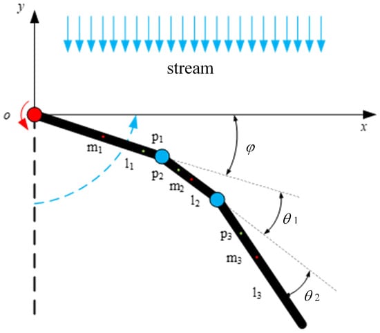 The paddling propulsion mechanism is designed as a finite structure so that the passive joints do not bend in the stroke phase, and thus the corresponding stiffness is assumed to be infinite when . In the stroke stage, the paddling propulsion mechanism is modeled as a two-dimensional connecting rod with a rotary joint, and the connecting rod is driven to oscillate by the torsion spring, as shown in Figure 12. The length of the connecting rod is , and its mass is . Assuming that the mass of each connecting rod is concentrated at its midpoint, the distance from the leading end of the connecting rod to its center of mass is represented as . The free angle of the torsion spring is 180°, and the initial mounting angle is .