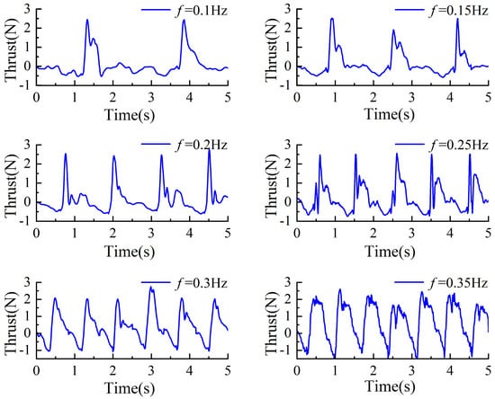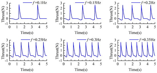 Under the same torsion spring stiffness, the y-axis directional thrust corresponding to different driving frequencies is shown in Figure 13. Positive and negative values represent the direction of the thrust, where positive values indicate propulsive forces acting on the propulsion mechanism, and negative values indicate resistive forces. As depicted in the figure, during the returning phase, the swimming foot experiences resistance, and the magnitude of this resistance gradually increases. In contrast, during the stroke phase, the swimming foot generates thrust, which instantaneously increases and then diminishes as the swimming foot swings backward through a larger angle, until it returns to its initial position. Based on the data presented, higher driving frequencies result in greater resistive forces during the returning phase, while the effective propulsive forces generated during the stroke phase remain largely consistent.
