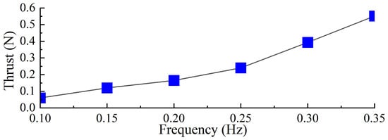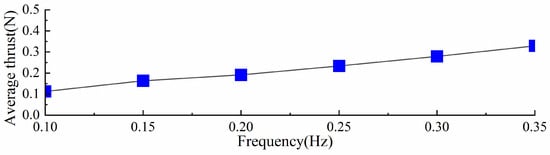 Based on the experimental results, the average thrust generated by the single-sided propulsion mechanism during a single cycle was calculated for different frequencies, as shown in Figure 19. The results indicate that as the driving frequency increases, the average thrust produced by the propulsion mechanism also increases. The experimental phenomena and the trend of thrust variation are consistent with the previously simulated trends. Combining Figure 18, it can be observed that the actual stroke time of the swimming foot during the stroke phase remains constant. However, as the driving frequency increases, the proportion of effective stroke time within the stroke phase increases. Although the resistance encountered by the swimming foot during the return phase increases with frequency, the magnitude of this increase is relatively small compared to the influence on the stroke phase. Therefore, as the driving frequency increases, the average thrust generated by the propulsion mechanism increases accordingly.