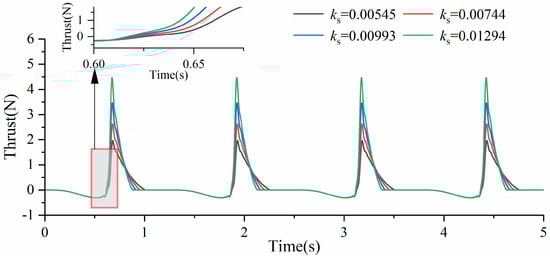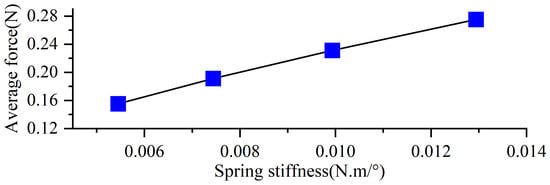 As shown in Figure 16, the variation in average thrust generated by the swimming foot under different torsion spring stiffness conditions is presented. The results reveal that the average thrust consistently increases with the increase in the stiffness of the torsion spring [28]. Under the same driving frequency, increasing the spring stiffness effectively enhances the average thrust produced by the propulsion mechanism.