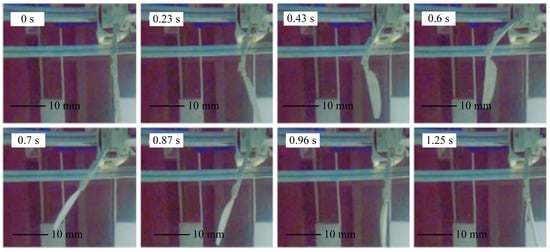 The motion status of the swimming foot during water oscillation was recorded using a high-speed waterproof camera. As an example, at a driving frequency of 0.2 Hz, the motion status is shown in Figure 20. The swimming foot completes a full cycle in 1.25 s, with the return phase (0–0.63 s) lasting 0.63 s and the stroke phase (0.63–1.25 s) lasting 0.62 s. The actual water-paddling time (i.e., the effective paddling time of the swimming foot) is 0.36 s.