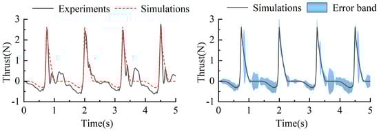 The simulation results demonstrate that both the driving frequency and spring stiffness significantly influence the thrust performance. Under the same spring stiffness, increasing the driving frequency can further elevate the average thrust. Additionally, with the same driving frequency, a higher torsion spring stiffness results in a faster increase in thrust values and achieves a larger maximum thrust.