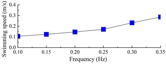 Among the tested driving frequencies, the robot achieved its maximum swimming velocity of 0.82 BL/s at a servo driving frequency of 0.35 Hz. As shown in Figure 18, an increase in driving frequency resulted in a higher average thrust generated by the swimming propulsion mechanism, and this trend was consistent with the variation in the robot’s swimming velocity. Considering the relatively large mass of the robot, the ratio of speed to mass is more meaningful. Our robot has a mass of 2.6 kg and a ratio of speed to mass of 0.315 BL/s per kg. The frog-inspired swimming robot has a swimming speed of 0.43 BL/s [13]. Compared to it, our diving-beetle-inspired robot swims faster.