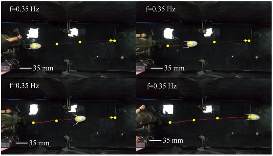 To evaluate the swimming performance of the biomimetic underwater robot under a torsional stiffness of 0.00744 Nm/°, experiments were conducted to investigate the effects of different driving frequencies on its propulsive swimming performance. The robot’s swimming speed was measured under various swimming gaits, including forward swimming and turning maneuvers. As illustrated in Figure 23, the swimming speed of the robot was recorded at different frequencies, with the forward swimming process at 0.35 Hz shown in Figure 24. Data processing and analysis were performed using motion analysis software to quantify the robot’s locomotive performance.