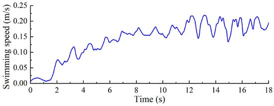 As shown in Figure 25, the relationship between swimming velocity and time was measured for the swimming propulsion robot under a servo driving frequency of 0.2 Hz. The velocity begins at 0 m/s and gradually increases, reaching a relatively stable value of 0.175 m/s. Thereafter, the velocity fluctuates slightly around this value. The velocity curve exhibits a wavelike pattern, characterized by a periodic trend of increasing, decreasing, and then increasing again. This variation is primarily attributed to the two distinct motion phases in the swimming propulsion mechanism’s operating cycle: the “stroke” phase and the “return” phase. During the stroke phase, the propulsion mechanism generates thrust by moving backward, which accelerates the robot. Conversely, during the return phase, the mechanism moves forward, encountering water resistance, which decelerates the robot. Consequently, the robot’s velocity fluctuates accordingly. Throughout the swimming process, the robot’s velocity increases from 0 and stabilizes at a certain level after reaching a specific threshold. Compared to the frog-inspired swimming propulsion robot [13], the diving-beetle-inspired swimming propulsion robot demonstrates a relatively higher swimming velocity, as evidenced by the experimental results.