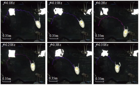 This robotic design exhibits axial symmetry in its overall structure; consequently, the swimming performance metrics, including swimming velocity and turning speed, are similar for both left and right turning gaits. This investigation focuses on the right-turning gait as a representative case for analysis. Consistent with the previous experimental setup, the driving frequencies for the servos during the experiments were maintained. The swimming states of the robot under different frequencies during the right-turning gait are illustrated in Figure 26.