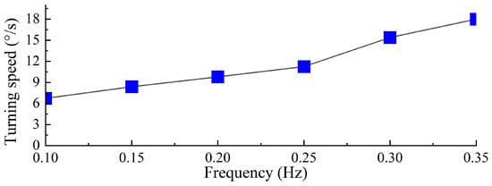 As shown in Figure 27, based on the swimming data of the right-turning gait at different driving frequencies, combined with video data and motion analysis software, the turning speed of the biomimetic diving beetle propulsion robot under different frequencies was calculated and measured. The results indicate that as the driving frequency increases, the turning speed of the robot also increases. At a driving frequency of 0.35 Hz, the robot achieves its maximum turning speed of 18°/s. The increase in driving frequency significantly enhances the robot’s turning capability, and within a certain range, the turning speed increases with the driving frequency. Compared to the frog-inspired propulsion robot [13], the biomimetic diving beetle propulsion robot demonstrates a faster turning speed.