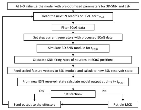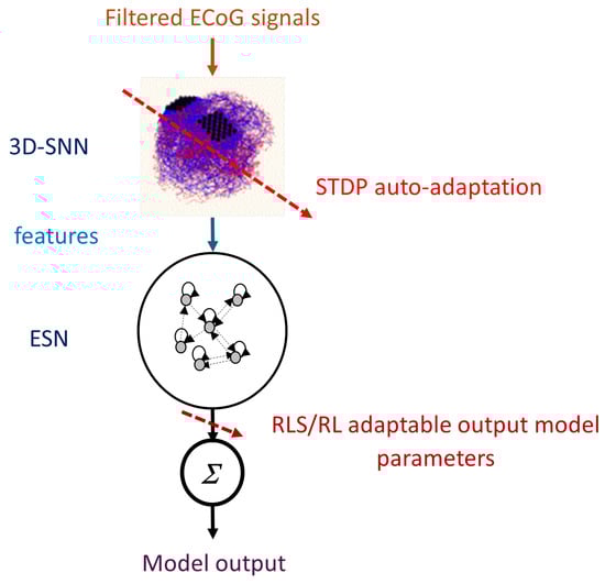 The patterns learned in the SNN from the ECoG time series data are neurons’ spiking frequencies during a given period of time. They are classified by a recurrent fast trainable neural network architecture called Echo State Network (ESN). A preliminary version of this framework was first tested on a benchmark EEG data, producing better classification results than an original system [18]. Here, this framework is further developed for MCD on ECoG signals and tested on the case study data from [10,12]. The proposed framework is shown in Figure 1. It consists of two basic modules: