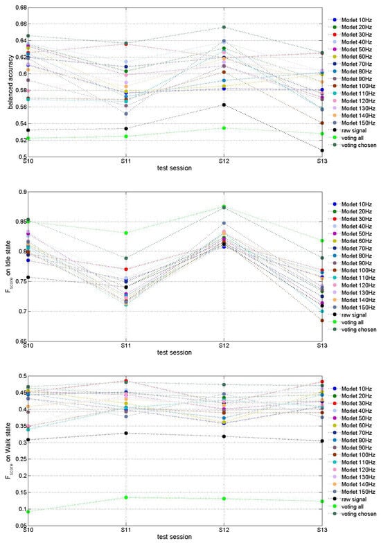 Table 2. Mean values of the balanced accuracy and F s c o r e s on classes idle and walk for testing data sessions of all models from Figure 5. Best results are marked in bold.