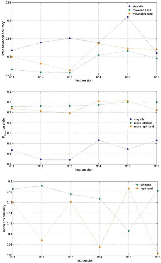 Figure 6. Testing accuracy of exemplar MCD on 6DoF DB. The top figure presents accuracy of prediction of the three classes of the state desired (idle, move left hand, move right hand). Middle plot shows F s c o r e on three state classes. The bottom plot shows mean cosine similarity per test session of the predicted vs desired hand trajectory.