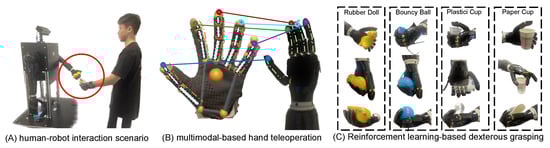 - Xia, Z.; Deng, Z.; Fang, B.; Yang, Y.; Sun, F. A review on sensory perception for dexterous robotic manipulation. Int. J. Adv. Robot. Syst. 2022, 19, 17298806221095974. [Google Scholar] [CrossRef]