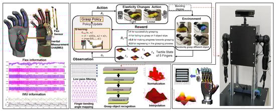 The experimental procedure follows a three-stage architecture of “demonstration imitation-online learning-tactile optimization” (under the framework of Figure 2), implemented as follows: First, eight volunteer operators wearing data gloves randomly performed multiple grasping demonstrations (over 10 trials) for four types of objects: rubber doll, elastic ball, plastic cup, and corrugated paper cup. During grasping, the multimodal mapping results from glove data were fed back to drive the five-fingered dexterous hand in synchronous motion to replicate identical postures, while sensing the pressure distribution matrix from fingertip tactile sensors. The reinforcement learning module constructs an initial Q-table by integrating demonstration data through an -greedy strategy (exploration rate = 0.4). Thereafter, the online learning phase commences: employing a dynamic learning rate (baseline value 0.2, adaptively adjusted with tactile pressure gradients) and multiple discount factors = 0.1, 0.3, and 0.5 to update Q-values based on real-time tactile feedback.