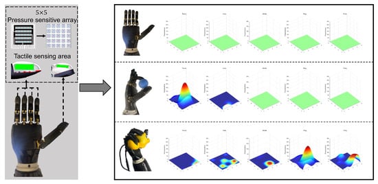 Figure 4. Introduction of tactile perception of dexterous hands and data states under different grasping states. - Object properties:where m denotes mass (kg) and k represents stiffness coefficient (N/m).