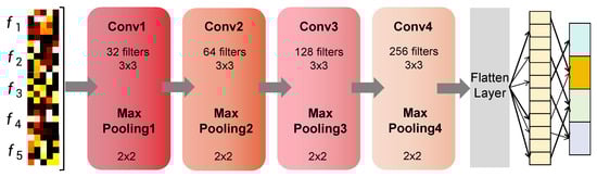 The architecture begins with a feature extraction module comprising four sequential convolutional layers. Each layer employs convolutional kernels with ReLU activation and batch normalization, progressively increasing the number of filters to hierarchically encode multi-scale spatial patterns. A max-pooling operation follows every convolutional layer to reduce feature map dimensions while preserving dominant activation patterns. To ensure robust generalization, batch normalization is applied after each convolution to stabilize training dynamics, and a dropout layer (rate ) is introduced after the final pooling stage to mitigate overfitting.