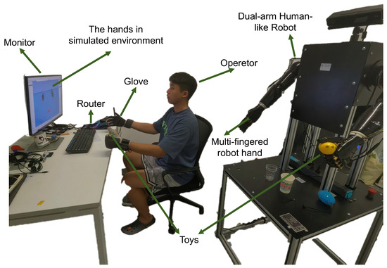 - Humanoid Dual-arm Robot: The core of the experimental setup is a dual-arm humanoid robot, consisting of a fixed base, anthropomorphic mechanical arms, a tactile five-finger dexterous hand, a depth vision unit, and a main control unit. The anthropomorphic mechanical arms feature shoulder joints with three rotational degrees of freedom (DoFs), enabling forward-backward swinging, inward-outward expansion, and rotational movements; the elbow has one pitch DoF for flexion-extension control, while the wrist integrates three rotational DoFs. The tactile five-finger dexterous hand comprises six DoFs in total, with each finger equipped with a single-axis linkage bending joint for grasping actions, and the thumb additionally provided with a flexion-extension DoF to enable bidirectional motion capability. The fingertip area integrates a high-density tactile sensor array, capable of detecting force interactions within a range of 0–5 N. Additionally, the depth vision module, located at the top of the robot, can acquire RGBD view data within its range, while the main control unit board, positioned at the center of the robot’s body, handles signal transmission and reception, performs related edge computing, and is equipped with connectivity options, including a standard serial port and a modern Wi-Fi interface.