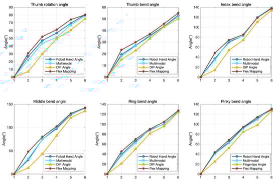 To enable teleoperation of the robotic hand that closely emulates human gestures, the system integrates a sophisticated multisensor data fusion methodology. Central to this approach is a comparative study that critically evaluates the performance of the fusion technique against two alternative approaches: one based on controlling the DIP joint angles and the other focused on the flexural bending of the joints. The experimental results, visually presented in Figure 7, reveal an important observation: reliance on the angle control of the DIP joint alone leads to significant mapping errors, particularly when there are small variations in angle. This issue can be attributed to the fact that natural hand movements require the simultaneous adjustment of multiple joints, and subtle variations in DIP angles are often compounded by changes in adjacent joints, which are not considered in this approach. In contrast, the flexural bending method introduces challenges of its own, primarily due to the complex interdependencies among the various degrees of freedom in the robotic hand. The motion of a single joint can affect adjacent joints, creating difficulties in achieving effective alignment.