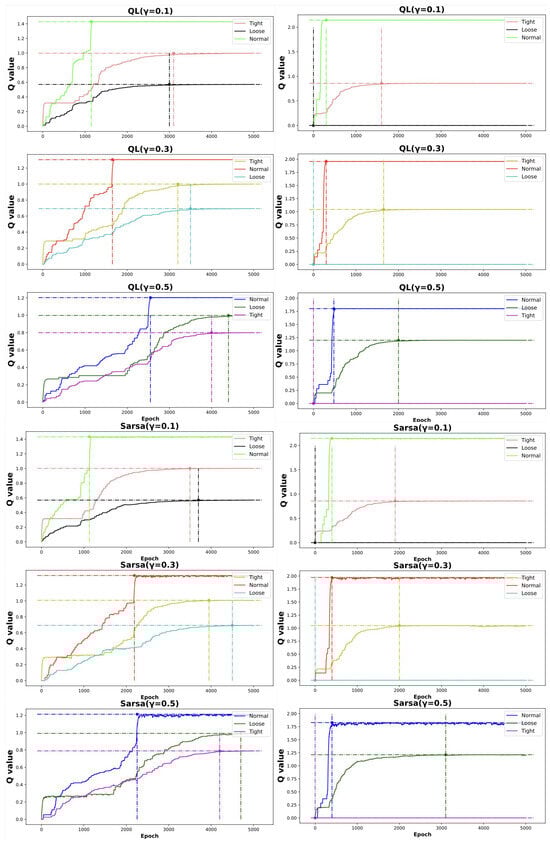 The empirical results depicted in Figure 8 provide a comparative analysis of Q-learning and SARSA under varying discount factors (, , ). The Q matrices are designed to encode distinct tactile-driven grasping states derived from the pressure distribution matrices, where states such as ‘loose grasp’ and ‘stabilized grasp’ are mapped to reward structures. In particular, the matrices