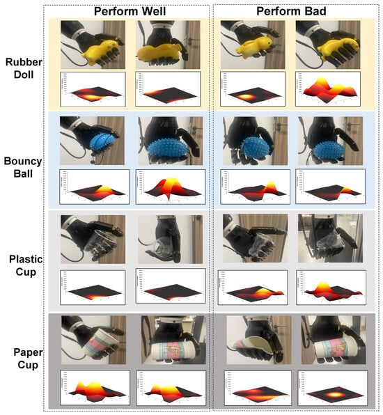 Figure 9 provides a meticulous evaluation of the robotic hand’s performance in a diverse set of object grasping scenarios through visual imagery and tactile matrices, while distributed matrices with moderate intensity typically signify successful grasping. Conversely, non-uniform distribution with pronounced concentration often suggests either overly firm or insufficiently secure grasps. The tactile sensors embedded in the hand play a pivotal role, serving as the essential instruments to capture critical metrics that are fundamental to assessing the effectiveness of the grasping process. Through a careful analysis of the tactile data, particularly examining the subtle variations in sensor responses that correspond to the distinct material properties of the objects, our study uncovers valuable insights into the various grasping strategies. This chapter underscores the significant role of grasping techniques in object recognition, with particular attention to the variance in grasp quality. Grasps that exhibit excessive force often lead to object deformation, which not only harms the object, but also hinders the ability of the robotic hand to maintain stable hold. In contrast, grasps that lack sufficient force risk instability, which can cause the object to slip from the grasp of the hand. In contrast, the ideal grasp demonstrates a harmonious balance, where force is applied with precision, ensuring both stability and effective manipulation without any detrimental effects on the object.