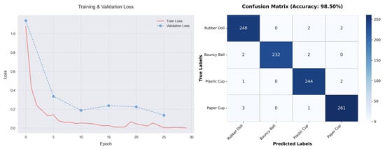 The tactile-driven object recognition module was rigorously evaluated through specialized trials. For classifying the four target objects (rubber doll, bouncy ball, plastic cup, paper cup), we implemented a streamlined DCNN architecture (detailed in Section 3.3) to balance accuracy and computational efficiency—a critical requirement for real-time deployment on the robotic mainboard. The training utilized various types of data successfully grasped in RL experiments. The protocol involved: (1) Data preprocessing: Normalizing pressure values to [0, 1] based on sensor range; (2) Optimization: Adam solver (lr = , batch size = 32) with early stopping (10-epoch patience). The model is based on PyTorch Mobile 2.5.0 for lightweight direct loading and inference. The training graph of the model and the error matrix graph of the test results are shown in the Figure 10.