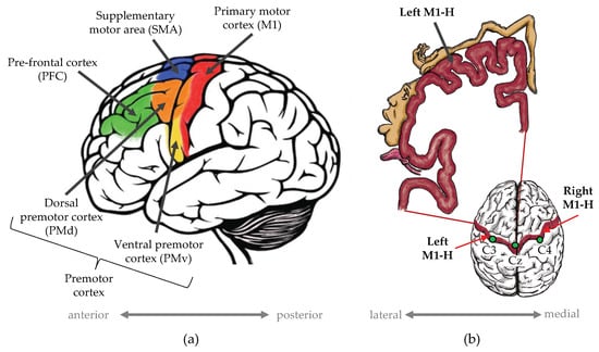 (a) Some regions of interest (ROIs) and (b) homunculi of M1 [,,,,]. C3, C4, and Cz denote electrode positions according to the 10–20 system [].