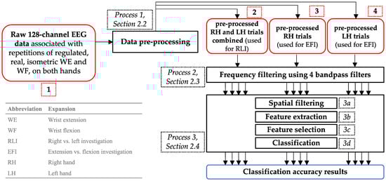 The analysis was performed on high-resolution, 128-channel EEG data, shown as red block 1 in Figure 2. The experimental data-recording protocol, the participants, and the equipment were described in our former report []. Table 2, as well as the remainder of this section, provides an overview of the data acquisition procedure. This contextualises the subsequent explanation of the analysis and classification methods presented in this article.