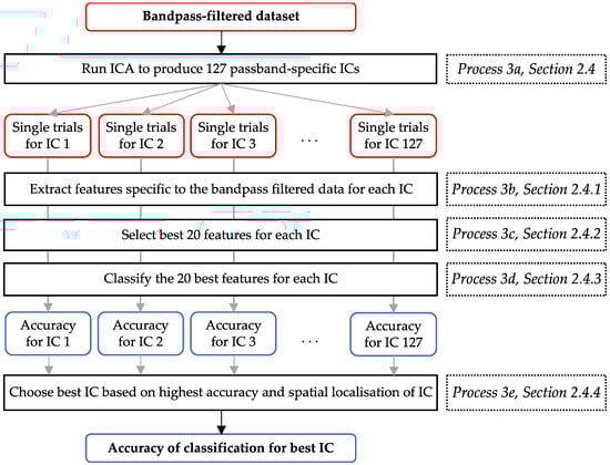 In the pre-processing stage (process 1 in Figure 2), we used ICA to remove artifacts. We used ICA again as a spatial filter to approximate and isolate signals emanating from the seven abovementioned ROIs. This is shown by process 3a in Figure 4. ICA was implemented using the Infomax ICA algorithm [] to decompose each of the 12 datasets of bandpass-filtered, single-trial data from each participant into 127 ICs. This process generated ICs that were specific to a given participant; their RH, LH, or both hands; and a frequency range. It was, thereafter, necessary to determine which IC best represented motor control information emanating from the ROIs.