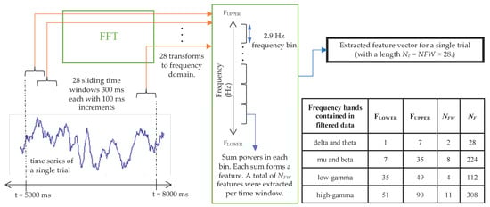 The time range from t = 5000 ms to t = 8000 ms was considered to include signals recorded when wrist movements were sustained at 15% of MVC (during S3, shown in Figure 3). An overlapping sliding window of 300 ms was applied in increments of 100 ms. A fast Fourier transform (FFT) was used to compute the power spectrum for each time window. The resulting power spectrum was then split into equal bands—each 2.9 Hz wide. The sum of the powers within each band formed a feature []. Twenty-eight time windows were extracted over the time range considered. The total number of computed features per trial—forming a feature set—is summarised in Figure 5 and depended on the number of frequency bins that fit between the upper and lower frequency limits.