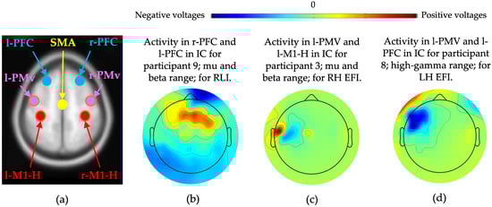 The spatial activity of each IC from the abovementioned subset of ICs was manually inspected using topographical maps from EEGLAB. The IC with the highest accuracy that also exhibited spatial activity in proximity to the ROIs (SMA, right and left M1-H, right and left PMv, and right and left PFC) was determined to be the best-performing IC.