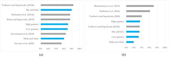 Comparison of the mean accuracies from Table 3 and Table 4 in this study (blue) and mean classification accuracies in the literature shown in Table 1 (grey) for (a) the RLI and (b) the EFI. “Maximum of all frequency bands” denotes the means of the maximum participant-specific accuracies, considering all frequency bands [,,,,,,,].