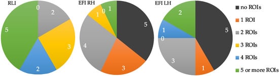 Figure 8 shows the percentage distribution of “T1” values across all participants for the RLI and EFI. This figure compares the number of ROIs—from each participant—approximated to produce accuracies above the threshold accuracies described in Section 2.4.5. Ten out of the twelve participants showed activity emanating from three or more regions in the RLI, and the other two showed activity emanating from two regions. For the EFI, activity in two or more regions was observed in 5/14 participants for RH and in 6/12 participants for LH. For the EFI, some participants (five for RH and five for LH) did not display activity in any ROIs, since their ICs yielded accuracies below the threshold accuracy of 67.5% (described in Section 2.4.5).