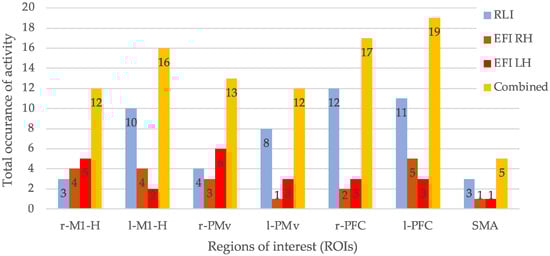 Figure 9 shows the “T2” values for the ROIs for the RLI (Table 5) and the EFI (Table 6)—individually and in combination. This graph indicates neural activity in proximity to all seven ROIs, i.e., SMA and bilateral M1-H, PMv, and PFC. The combined (summed) occurrences of activity for both investigations across all participants show that left and right PFC were most frequently activated, with 17 and 19 occurrences, respectively. Right PMv, left PMv, right M1-H, and left M1-H also displayed frequent occurrences, with 13, 12, 12, and 16 combined occurrences, respectively. The SMA was the least activated, showing only five occurrences. Activations in M1-H, PMv, and PFC were both contralateral and bilateral.