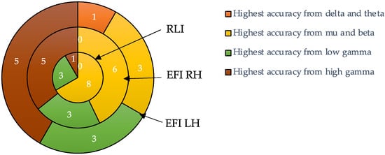 The pie charts in Figure 10 depict the number of occurrences with which each band achieved the highest participant-specific accuracy, as indicated in bold in Table 3 and Table 4. The mu and beta bands yielded the highest accuracies in 8/12 participants for the RLI. The other four participants had their highest accuracies stemming from either the low- or high-gamma bands. For the EFI, the best accuracies were produced by features from either the low- or high-gamma bands for most participants (8/14 for RH and 8/12 for RH). The delta band yielded the lowest count of highest per-participant accuracies, i.e., one participant for LH EFI.