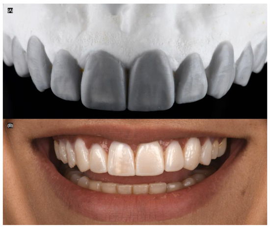 Lithium disilicate veneers. (A) Frontal view in master cast and (B) in a mirror.