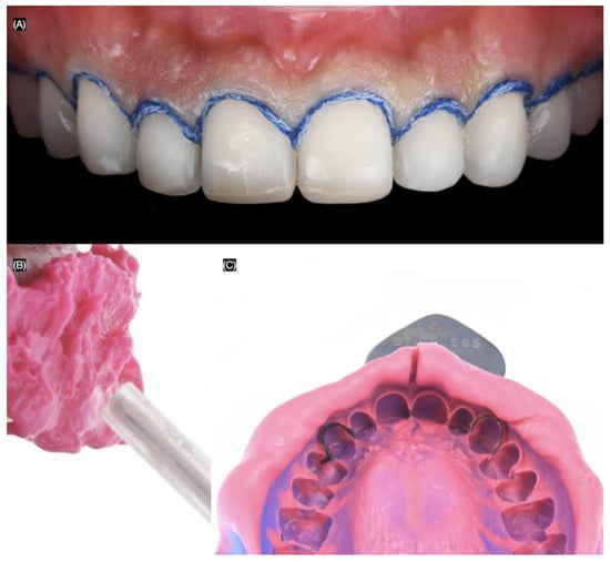 - Caponi, L.; Raslan, F.; Roig, M. Fabrication of a facially generated tooth reduction guide for minimally invasive preparations: A dental technique. J. Prosthet. Dent. 2022, 127, 689–694. [Google Scholar] [CrossRef] [PubMed]