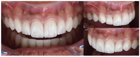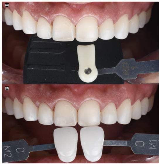Intra-oral photographs (Nikon D650) were taken using dentin (IPS Style Ceram Dentin Shade Guide, Ivoclar Group, Schaan, Liechtenstein) and enamel (A–D Shade Guide, Ivoclar Group, Schaan, Liechtenstein) shade guides, both with and without a black background, to evaluate the shade and substrate (Figure 6).