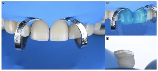 Clamps (Clamp B4, Brinker Hygienic, Coltene, Altstätten, Switzerland) were placed around the gingival contours of each tooth to be treated. The sequence began with both maxillary central incisors. The teeth were sandblasted with water and 29-micron aluminum oxide particles (AquaCare, Velopex, London, UK). Next, the teeth were treated with 37% phosphoric acid (Total Etch, Ivoclar Group, Schaan, Vaduz, Liechtenstein) for 15 s, gently air-dried, and primed with (Optibond FL, Kerr, Orange, CA, USA). Excess was removed, and finally, a light-shade luting resin cement (Variolink Esthetic LC, Ivoclar Group, Schaan, Vaduz, Liechtenstein) was applied to bond the lithium disilicate veneers. The excess cement was removed, and each restoration was cured for 20 s on the facial, 20 s interproximal, 20 s mesial, and 20 s distal (Figure 8).