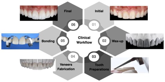 - Soares, P.V.; Spini, P.H.R.; Spini, P.H.; Carvalho, V.F.; Souza, P.G.; Gonzaga, R.C.D.Q.; Gonzaga, R.C.; Tolentino, A.B.; Machado, A.C. Esthetic rehabilitation with laminated ceramic veneers reinforced by lithium disilicate. Quintessence Int. 2014, 45, 129–133, Erratum in Quintessence Int. 2014, 45, 318. [Google Scholar] [CrossRef] [PubMed]