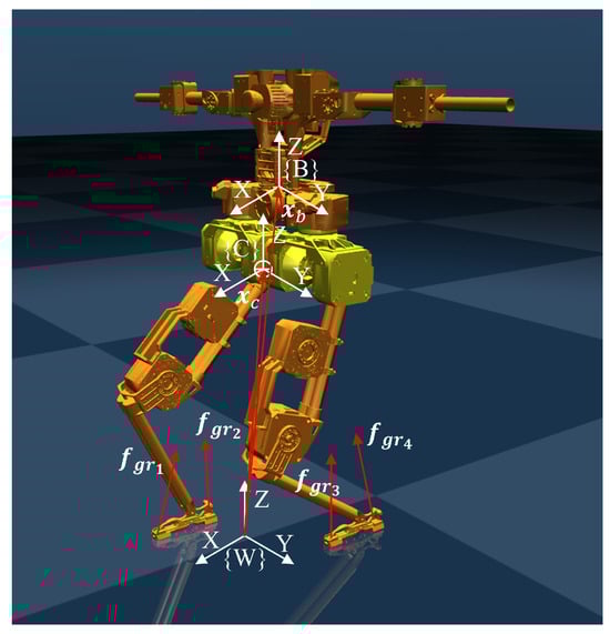 The transformed inertia matrix and Coriolis matrix are given by and , respectively. The scalar m represents the total mass of the bipedal robot, and is the gravitational acceleration vector. The first row of the equation corresponds to Newton’s law of motion, which governs the translational dynamics of the system’s CoM. The second row describes the rotational dynamics of the CoM frame, establishing the relationship between its angular acceleration and external forces. The third row models the internal motion of the multi-body system, specifically formulating the dynamics of the leg joint accelerations [30]. When the leg inertia is small, , , , and can be approximated as zero, meaning the Coriolis and centrifugal forces, due to the coupling between the leg motion and the CoM, can be neglected [28].