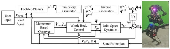 - Morlando, V.; Teimoorzadeh, A.; Ruggiero, F. Whole-body control with disturbance rejection through a momentum-based observer for quadruped robots. Mech. Mach. Theory 2021, 164, 104412. [Google Scholar] [CrossRef]