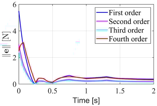 An analysis of the observer order was conducted to compare the estimation errors of observers with different orders. Figure 3 illustrates the estimation errors over time when a constant external force is applied to the robot. The first-order observer exhibits a higher overshoot in error compared to the second-order observer. As the order increases, the overshoot decreases. However, the overshoot increases again at the fourth order. If the order is further increased, the computation time becomes excessively long and there would be too many parameters, so no further comparisons were made. Among these four orders, the third-order observer performs the best. Therefore, in subsequent experiments, the order r was set to 3, and the coefficients , , and were chosen as , , and , respectively.