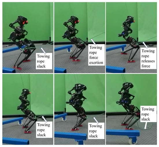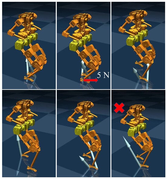In this experiment, an external disturbance was applied to the robot’s swing leg using a tether attached to the right leg. The other end of the tether was connected to a force sensor to measure the magnitude and duration of the applied force. Figure 9 shows snapshots of the experiment. Initially, the tether was slack, and no external force was applied to the swing leg. When the tether was tightened, the swing leg began to experience an external force. Once the swing leg touched the ground, the external force was removed, and the tether returned to a slack state. From the figure, it can be seen that the robot maintains stable walking even when the swing leg is subjected to an external disturbance. The experiment demonstrated that the robot could withstand a maximum external force of 5 N while maintaining stability, with the disturbance lasting approximately 0.2 s.