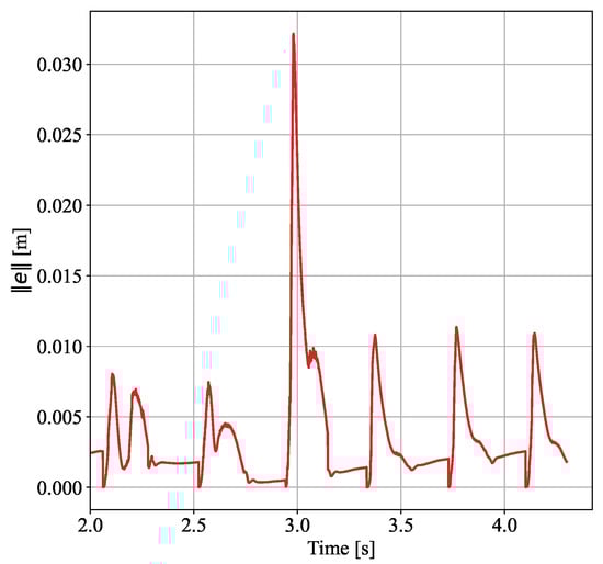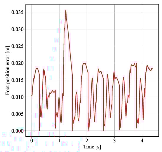 Figure 10 depicts the deviation curve between the actual and desired positions of the swing foot during the experiment. Here, the deviation is the 3D spatial distance deviation e, calculated as the square root of the sum of the squared deviations in the three spatial directions , , and , i.e., . As shown in the figure, when no external force was applied, the deviation between the actual and target positions remained within 2 cm. At approximately 1.1 s, the swing foot began to experience an external force, causing the position deviation to increase to 3.5 cm within 0.1 s. Due to the observer’s estimation and compensation of the external force in the proposed control method, the deviation decreased to 1.6 cm within 0.2 s, returning to the range observed in the absence of disturbance. This reduction minimized the impact of the external force on the swing foot’s landing position. Furthermore, the subsequent deviation remained within the 2 cm range, indicating that the effect of the external disturbance has been compensated and did not produce any further impact. The experimental results demonstrate that the proposed disturbance rejection control method effectively reduces the position deviation of the swing foot, ensuring stable walking of the robot when swing leg is under disturbance.