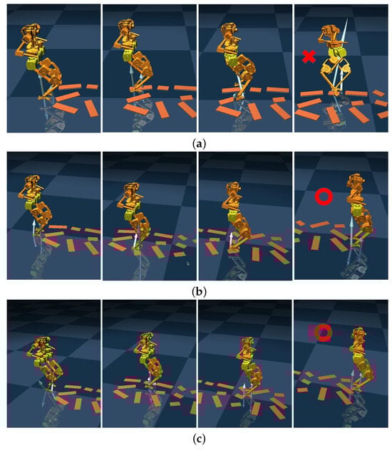 Simulation results of walking on uneven ground under three different control methods. The ‘x’ denotes falling incidents during locomotion, whereas ‘o’ represents successful navigation across the uneven terrain. (a) Standard WBC method; (b) CoM-based disturbance rejection WBC method in paper [25]; (c) proposed disturbance rejection WBC method considering disturbances on both legs.