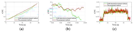 Comparison of CoM trajectories between the CoM-based disturbance rejection WBC method and the proposed method. (a) x direction; (b) y direction; (c) z direction.