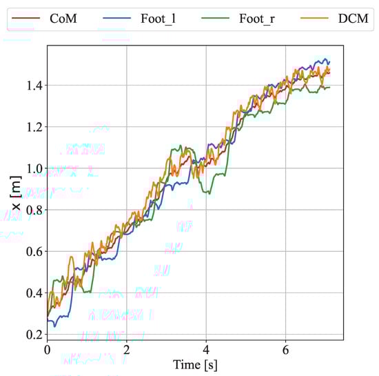 Trajectories of the CoM, left foot, right foot, and DCM in the x-direction during the complex disturbance experiment.
