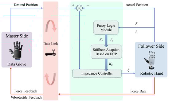 The general framework of the proposed method is depicted in Figure 1. Initially, the data glove with finger-to-finger force feedback and vibrotactile feedback modules on the master side captures the real-time movement angles of the human operator’s fingers. Subsequently, the captured data undergoes cleaning and smoothing processes before being transmitted to the dexterous robotic hand on the follower side. The dexterous robotic hand implements compliant control using impedance control and feedforward control, which operates in joint torque control mode instead of position control mode. The dexterous robotic hand continuously captures its current position and computes the difference with the desired position, which serves as the input for the impedance control. The specifics of impedance control will be elaborated upon in Section 2.3.1. When the force between the dexterous robotic hand and the object exceeds 0.15 N, it is determined that contact has occurred. The dexterous robotic hand subsequently provides real-time force feedback to the master side and transmits tactile vibration signals to notify the operator that contact has been established, transitioning the system into the shared control mode. Upon establishing contact with the object, the dexterous robotic hand identifies the object’s stiffness based on the fuzzy logic module, which will be elaborated upon in Section 2.2. Drawing inspiration from Dynamic Movement Primitives (DMP) and the way humans grasp objects of different stiffness, we propose Dynamic Compliance Primitives (DCP). DCP employ distinct stiffness coefficient profiles tailored to the grasping of objects with varying stiffness levels, which will be elaborated upon in Section 2.3. In the end, the integration and usage of the fuzzy logic module with DCP model to form FL-DCP controller are detailed in Section 2.4.