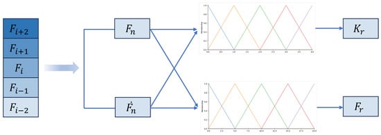 Here, denotes the centroid of the consequent set for the activated rule, and M represents the total number of activated rules. The terms and denote two input fuzzy sets. The terms and correspond to the membership functions for the inputs F and . The parameters and serve as the coefficients for the inputs, respectively. The symbol * indicates the t-norm operator used to combine these membership values.