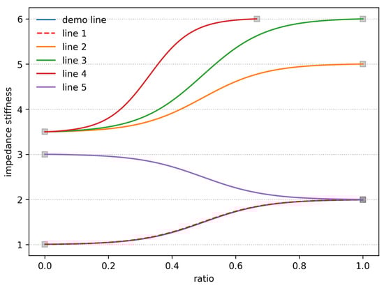 The simulation results of the DCP model, shown in Figure 3, demonstrate adaptive reproduction of stiffness coefficient profiles under varied initial and final conditions. From Figure 3, it is evident that once a stiffness coefficient profile has been established for learning purposes, the system demonstrates remarkable adaptability in reproducing similar contours across subsequent trials. Lines 1 to 5 are the reproduced contours. Specifically, even when the starting point remains constant but the endpoint varies, or when both the starting and ending points differ from the original demonstration, the system is capable of accurately generating a stiffness coefficient profile that closely resembles the initially demonstrated contour. It demonstrates its versatility and reliability in achieving compliant and precise grasping behaviors.