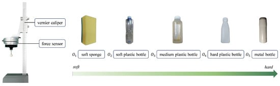 To validate the efficacy of the object stiffness identification method based on the fuzzy logic module, five common objects with different stiffness levels were chosen for the experiment. The objects, ordered from highest to lowest stiffness, are: hard metal bottle, hard plastic bottle, medium plastic bottle, soft plastic bottle, and soft sponge.